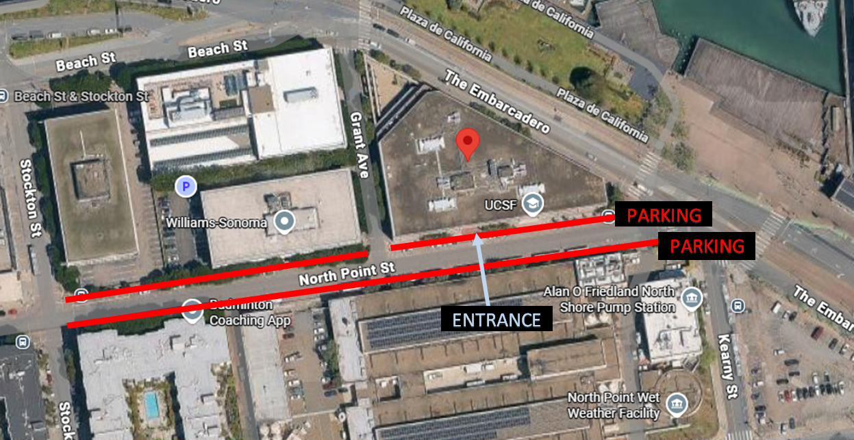 Entrance is also located on Northpoint street. Entry requires a UCSF badge, so if you arrive and no one is at the door, please call 925-819-6906 or 209-747-0498.